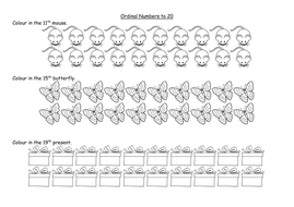Standard problems to write the ordinal numbers, interesting picture puzzles, exercises to differentiate ordinal and cardinal numbers, cut-paste activities and coloring.