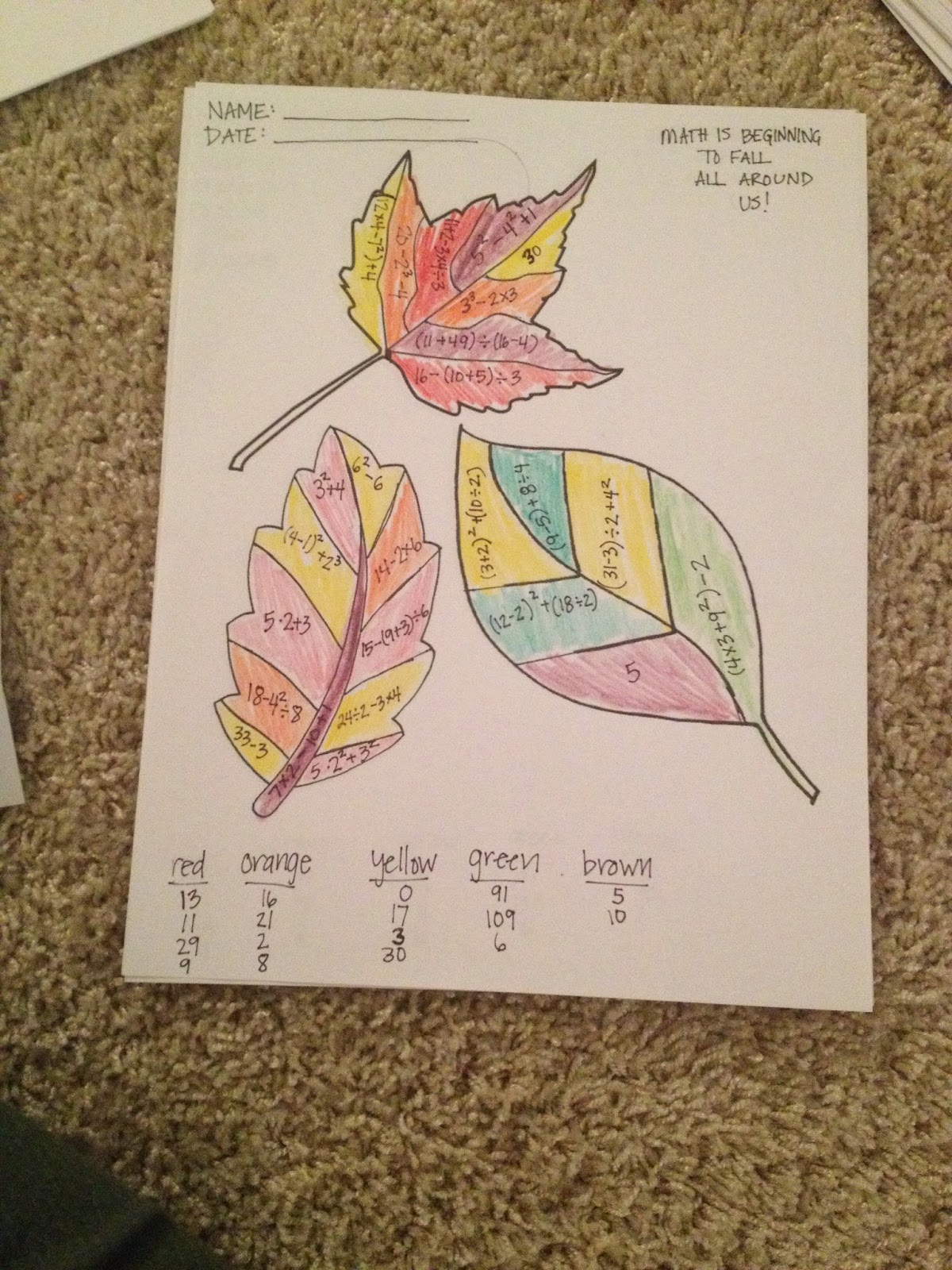 Order Of Operations Leaf Worksheet Colored. In this order of operations practice sheet, math and coloring go hand in hand! This worksheet introduces fifth graders to a friend who can help them remember the order of operations: PEMDAS!