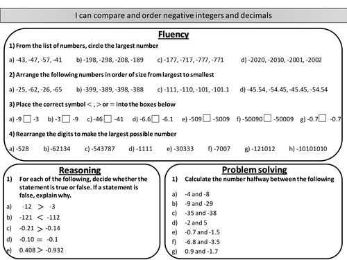 Compare and order negative integers and decimals - mastery ...